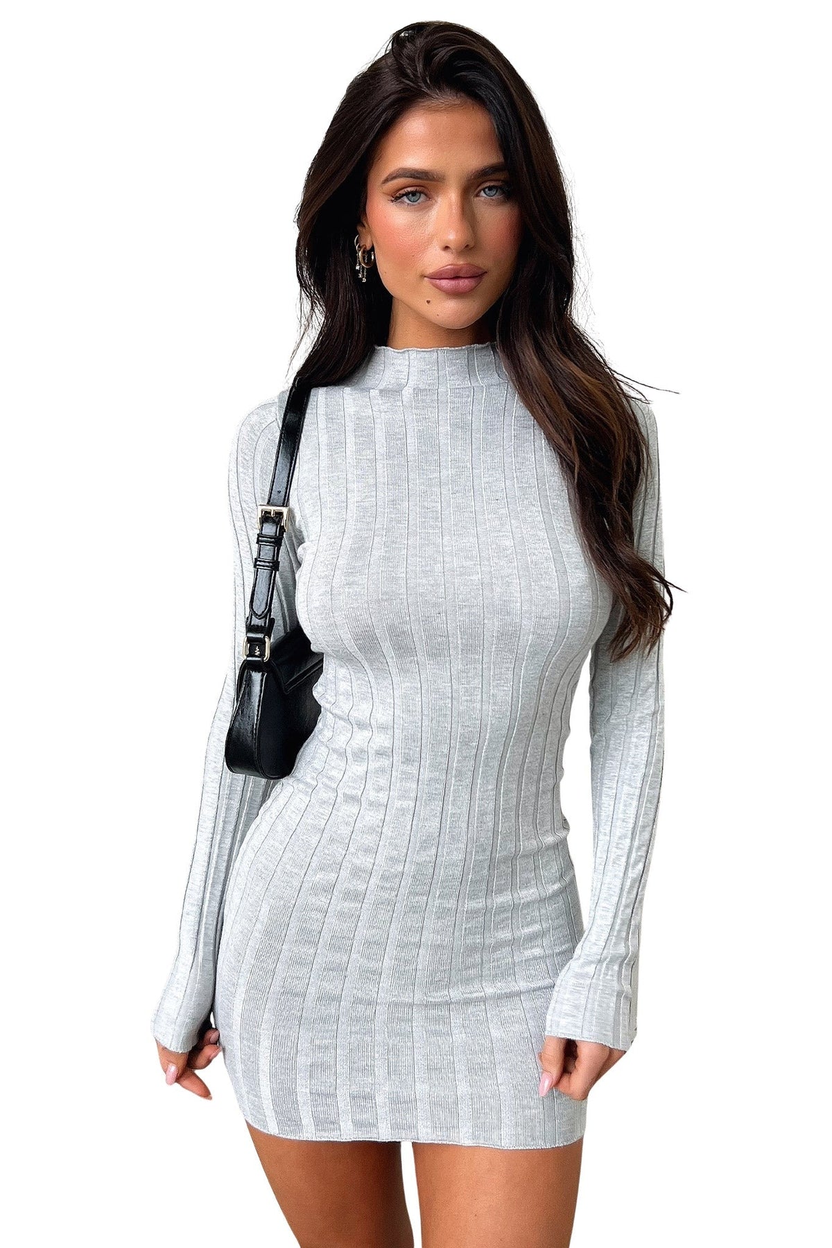 Warm up this winter with the Emily dress in gray, a crowd favorite. This figure-hugging beauty is made from a stretchy ribbed material with a turtleneck, ribbed details at the hems, and long sleeves. Reach your full potential with over-the-knee boots and a leather jacket.
